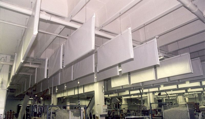 Ceiling suspended SonoCon Acoustical Baffles are a cost efficient, effective method to reduce the reverberant buildup of noise within a room often prevalent in multi-purpose rooms and factory spaces. They can help quickly improve acoustical privacy within open office space by reducing the intrusion of reflected conversations. They are widely employed in conference rooms, meeting places, and schools. They become a useful tool to reduce the overall noise levels with a minimum of disruption to activities or facility layout. Configured in a variety of materials, colors, and finishes, they can be matched to most industrial, commercial are architectural requirements.